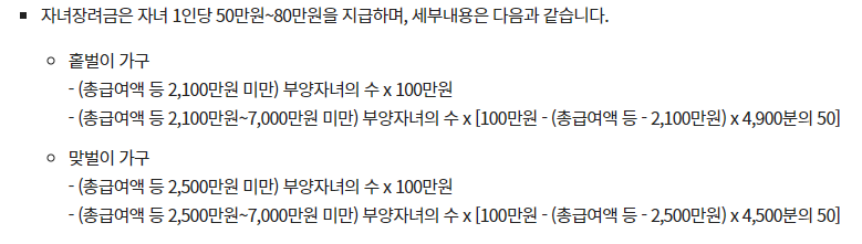 자녀 장려금은 자녀를 양육하는 저소득 가구를 대상으로 하며, 자녀의 교육비와 양육비에 대한 경제적 지원을 제공합니다. 자녀가 있는 가구는 근로 장려금 외에도 추가적으로 자녀 장려금을 받을 수 있어, 자녀 양육에 대한 경제적 부담을 줄이는 데 큰 도움이 됩니다. 자녀 장려금은 만 18세 이하의 자녀를 양육하고 있는 가구를 대상으로 하며, 장애 자녀의 경우 나이 제한 없이 지원이 가능합니다.