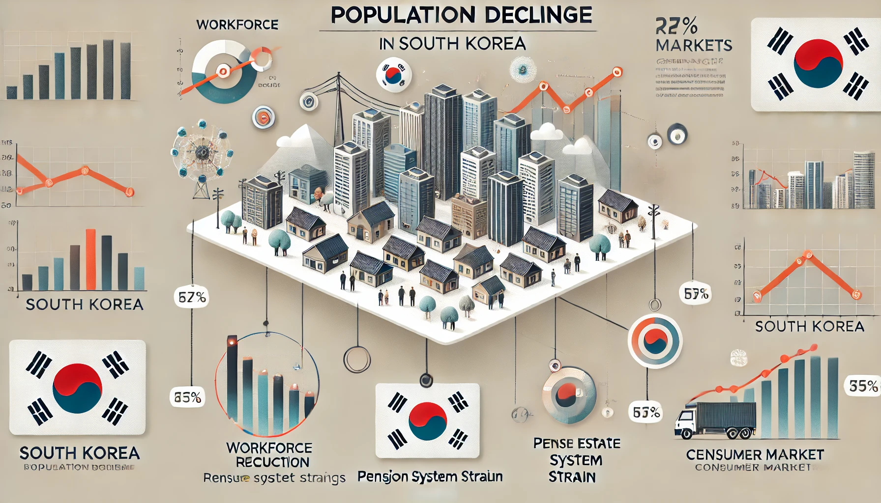 대한민국의 인구 감소가 가속화되면서 경제 전반에 미치는 영향이 점점 더 커지고 있습니다. 특히 노동력 감소, 내수 위축, 부동산 및 연금 시스템 변화 등이 주요한 이슈로 부각되고 있습니다.