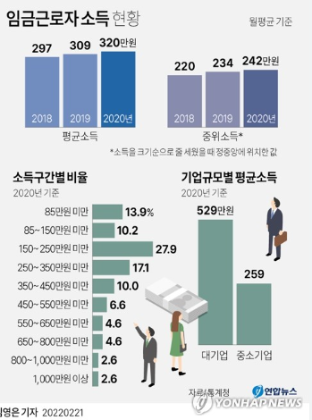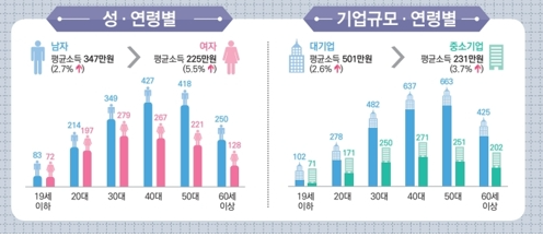 대기업, 전문직 종사자는 높은 소득을 올리는 반면, 중소기업 근로자와 자영업자는 상대적으로 낮은 수입을 기록하고 있습니다.