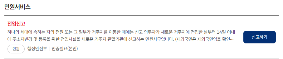 - '전입신고' 메뉴를 선택한 후, 신청하기 버튼을 클릭합니다.