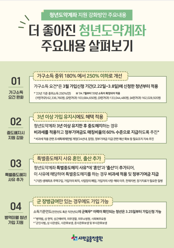 청년 도약 계좌는 청년들이 자산을 형성하고 경제적 안정을 추구할 수 있도록 돕는 중요한 금융 상품입니다. 정부의 지원금과 세제 혜택을 통해 목돈을 마련할 수 있는 기회를 제공하며, 특히 소득이 낮은 청년들에게는 큰 도움이 됩니다. 청년 도약 계좌의 혜택을 최대한 활용하기 위해 정기적인 저축과 자산 형성 목표 설정이 중요합니다. 위에서 소개한 방법들을 통해 청년 도약 계좌를 활용하여 안정적인 경제적 기반을 마련해 보세요.