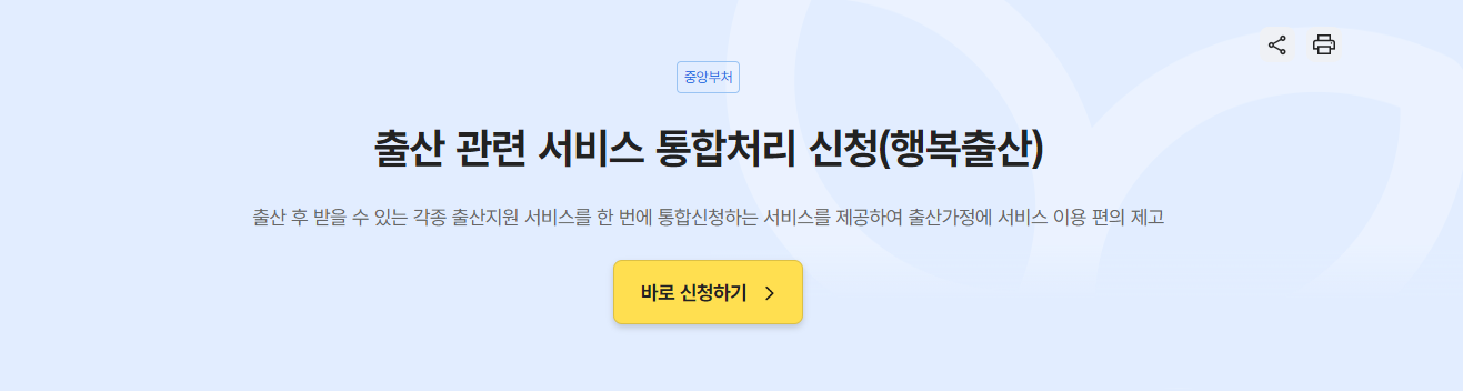 출산 후 받을 수 있는 각종 출산지원 서비스를 한 번에 통합신청하는 서비스를 제공하고 있습니다.