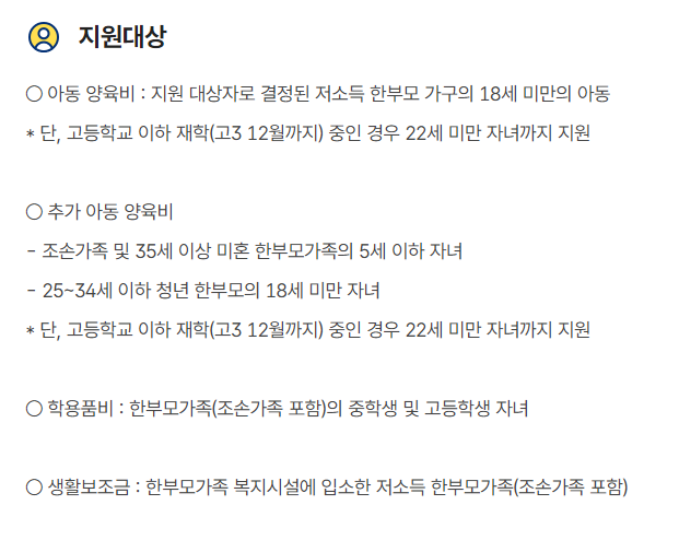 아동양육비 지원 대상자는 만 18세 미만의 자녀를 양육하는 저소득 한부모가정입니다. 소득 기준을 충족하는 가정이라면 누구나 신청할 수 있으며, 소득 인정액이 기준 중위소득 60% 이하인 경우에 해당됩니다. 또한, 자녀가 만 18세 미만이라면 양육비 지원이 가능합니다.